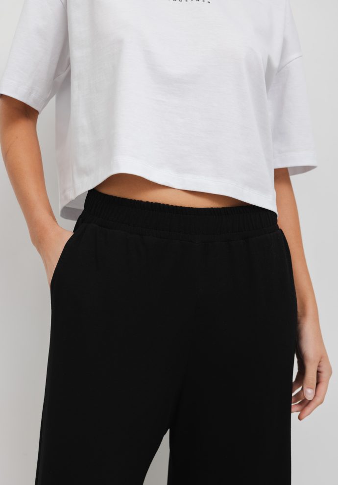 The pants have a classic cut. The legs are flared. There is a practical elastic at the waist. There are two side pockets – perfect for small items.