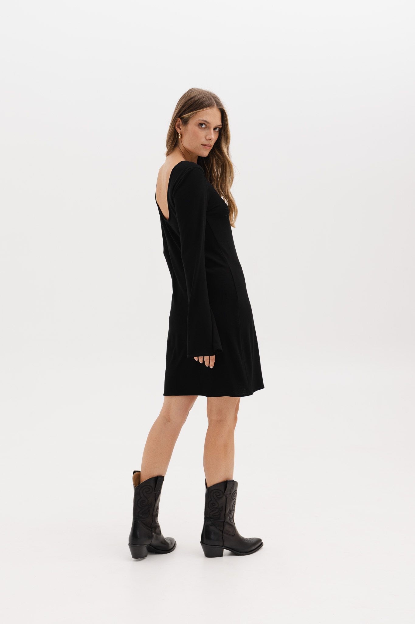 The dress has a slightly flared cut and wide sleeves, which add a light boho atmosphere to the styling. The dress has a deep neckline on the back, which subtly emphasizes the figure and gives the whole thing a refined, bold character.