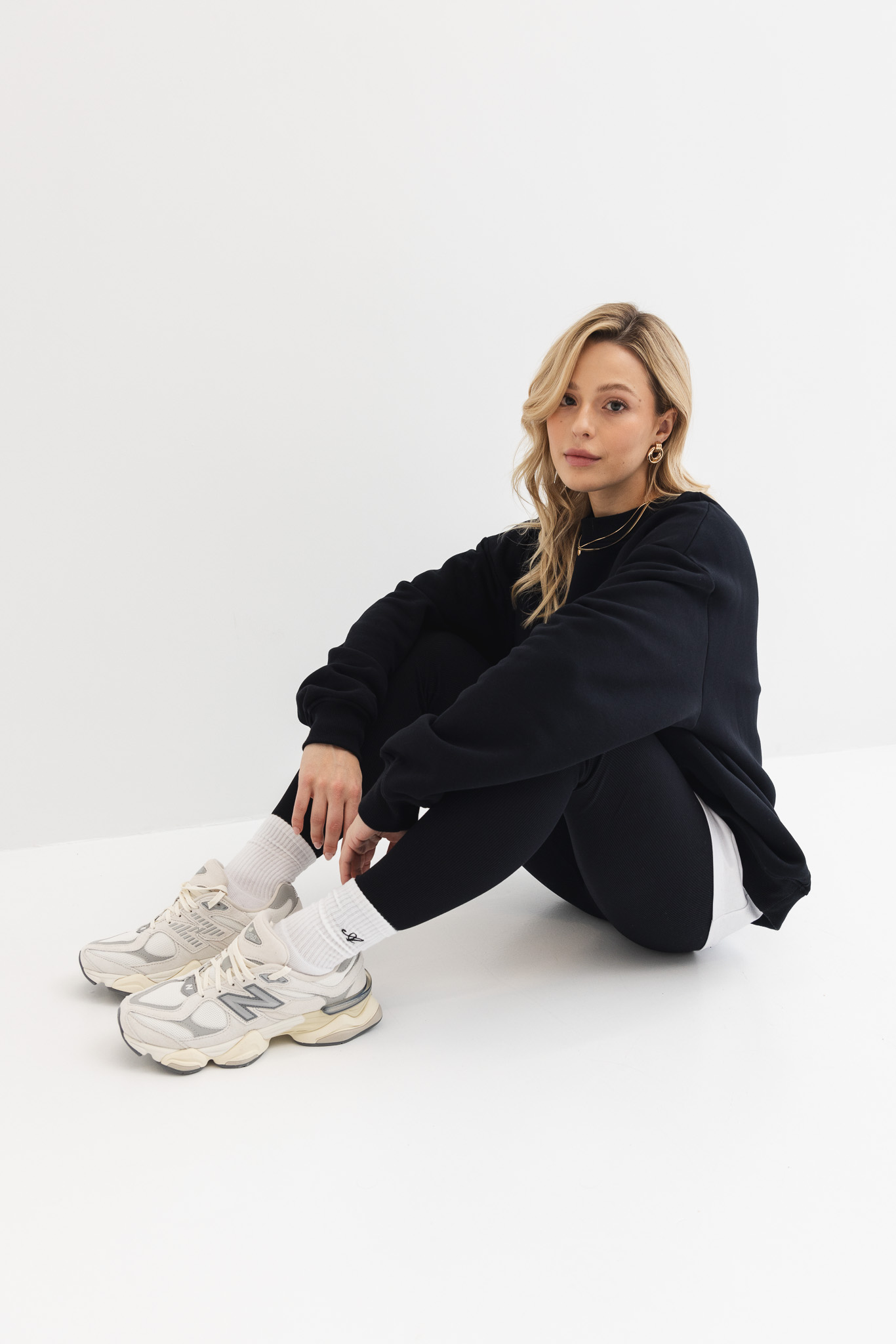 The generously oversized sweatshirt is a mix of comfort and modern style.