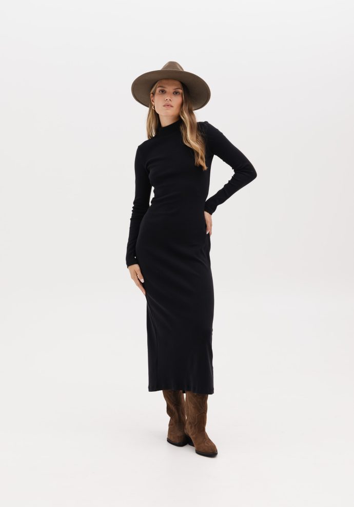 Its fitted tube-shaped cut beautifully emphasizes the silhouette, and the half-turtleneck adds elegance and makes it perfect for colder days. A delicate slit at the back provides freedom of movement, and the long sleeve adds harmony to the whole. However, it is the cutout at the bottom of the back that makes the Amy dress unique – it is a subtle detail that attracts the eye and gives it a unique character.