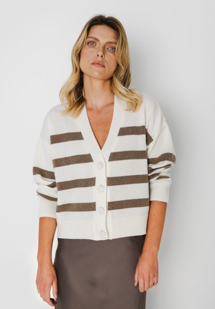 Subtle stripes in shades of ecru and warm brown make it suitable for many styles – from classic jeans to more elegant sets.