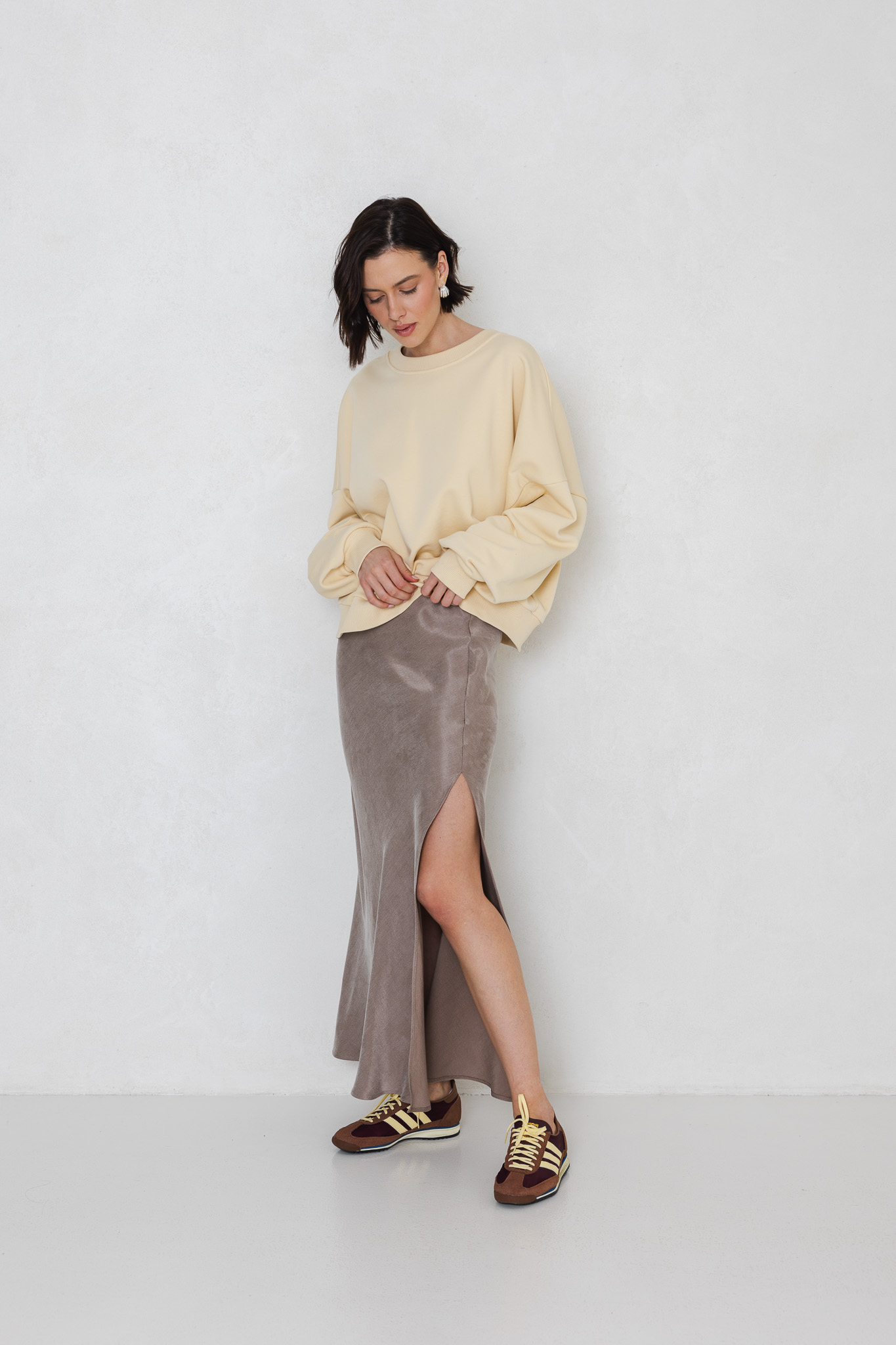 An oversized sweatshirt is a base for many casual styles. You can wear it both with skirts, e.g. a contrasting tight pencil skirt, and with pants – with jeans or joggers. In the summer, it will perfectly match your favorite shorts. And when you go to work out – match it with leggings or cycling shorts.