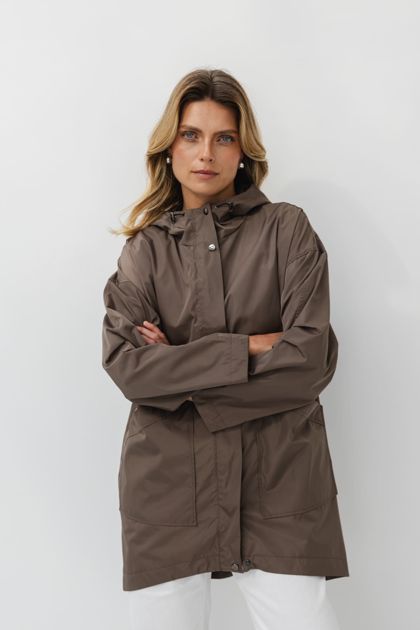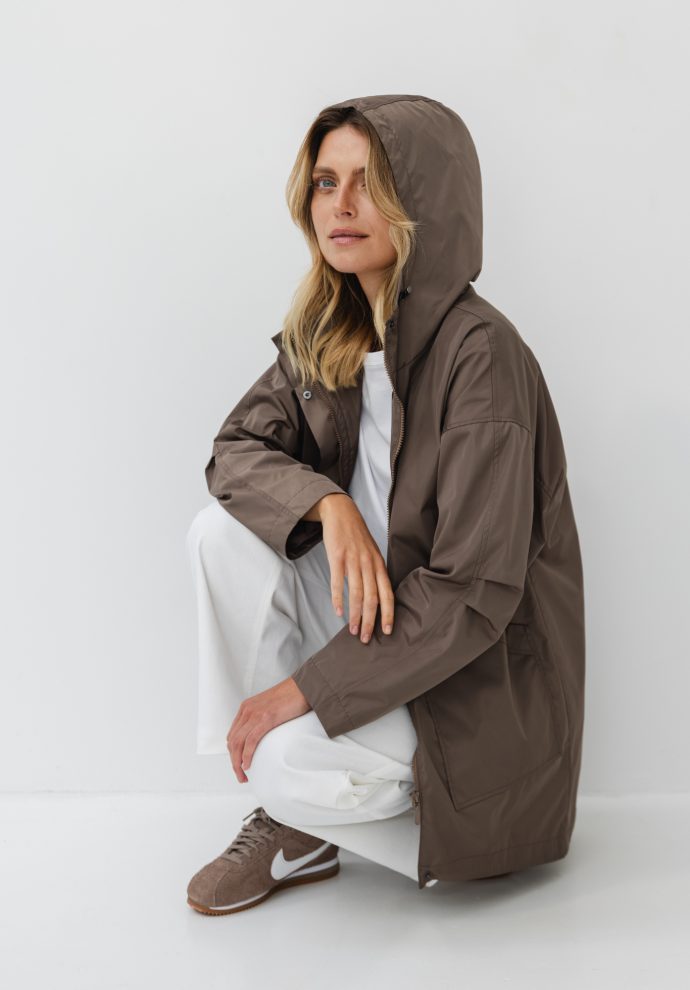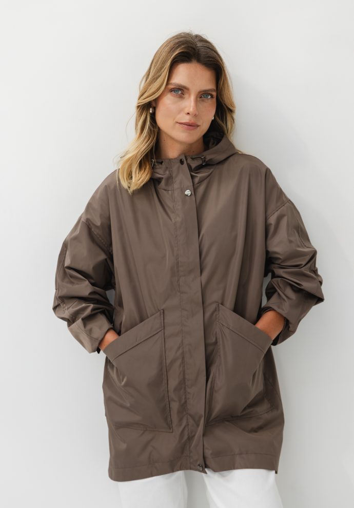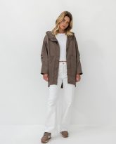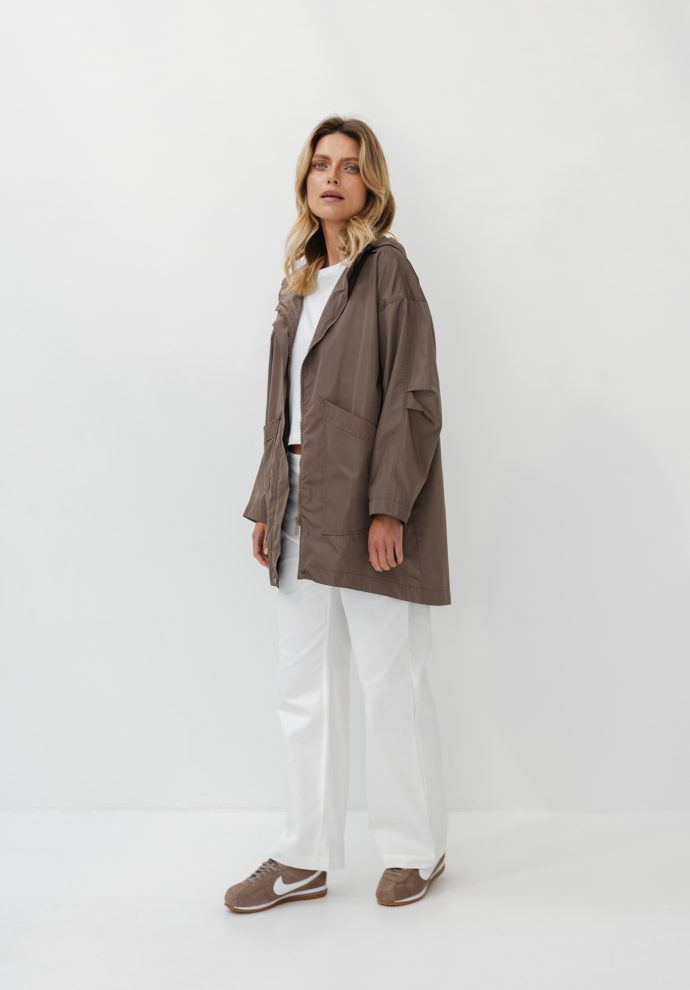 The characteristic longer back adds lightness and nonchalance, and the lowered shoulder line provides a loose, casual cut. The roomy hood and large, practical pockets make it ready for any outing – regardless of the weather.