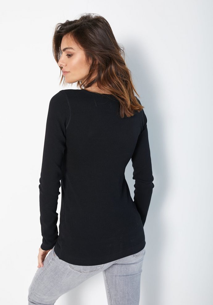 a sweater with a similar neckline. The blouse is made of a ribbed knit fabric