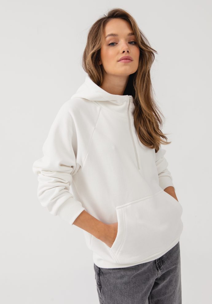 The sweatshirt has a spacious hood that fits great and protects against wind and cold. There is a zip at the front, which you can adjust to your preference. There is also a kangaroo pocket on the front, which is a very practical detail – you can keep your hands warm or carry a few small necessities. The sweatshirt has comfortable reglan sleeves for a relaxed feel. There are ribbed trims at the bottom and on the sleeves in the same colour.