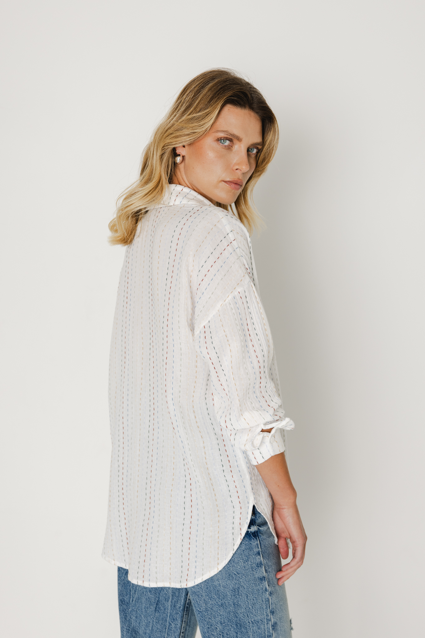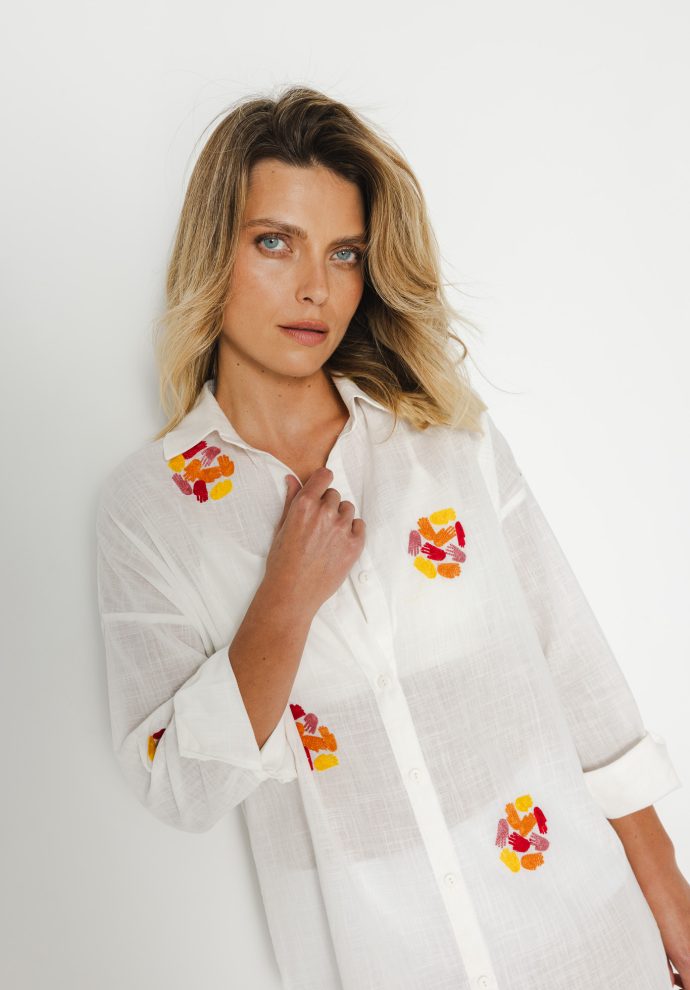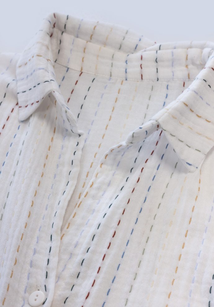The shirt goes great with shorts, sandals and a straw hat, but it will also work well in a more elegant version.